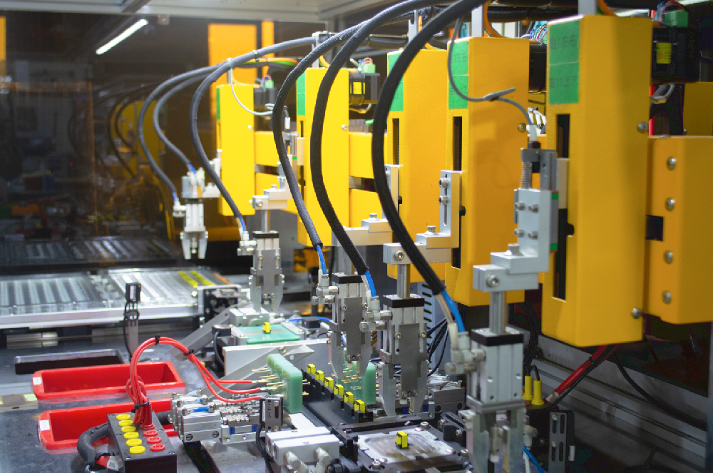 广西利顺电子有限公司 生产车间配备由多台自动绕线机、自动点胶机、自动焊片机、自动整剪脚测试码放机等设备组成的自动化流水线,可根据产品工序需求灵活组合,可满足多种不同需求产品的生产制造。
